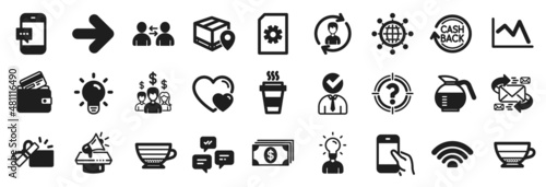 Set of simple icons, such as Americano, Communication, Next icons. Hearts, Chat messages, Coffeepot signs. International globe, Hold smartphone, File management. Light bulb, Megaphone. Vector