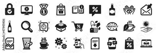 Set of simple icons, such as Special offer, Timer, Frappe icons. Champagne, Discount message, Creativity signs. Monitor settings, Phone messages, Best rank. Corrupted file, Whiskey bottle. Vector