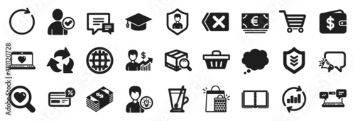 Set of simple icons, such as Web love, Shield, Search love icons. Book, Euro currency, Person idea signs. Globe, Market sale, Search package. Comic message, Security agency, Tea mug. Vector