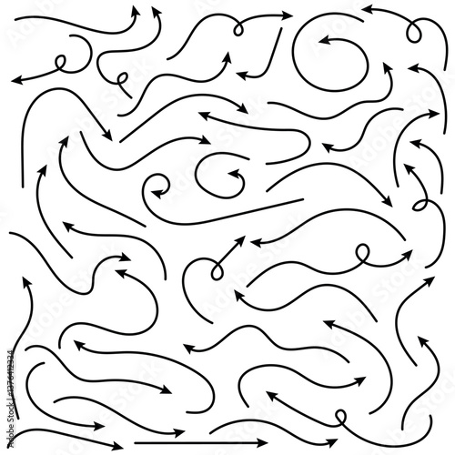Set of simple lines hand drawn black arrows in various style. Set of simple of hand drawn black arrows. Set of simple lines hand drawn black arrows. Hand drawn thin line arrows set.