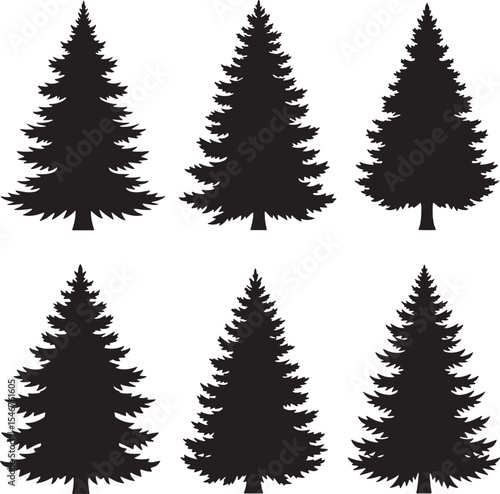 Set of Six Black Pine Tree Silhouettes Vector Design – Evergreen Forest Tree Icons for Nature, Winter, and Holiday-Themed Graphics