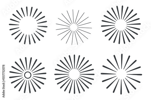 Set of Six Circular Radial Lines Design Elements simple symmetrical radiating lines forming circular patterns radial lines circular design geometric shapes vector graphics