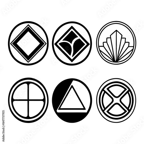 Set of six geometric shapes in circles isolated on white background, perfect for logo design and abstract art