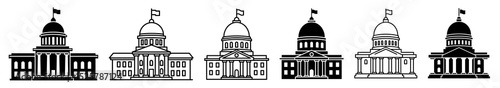Set of six government buildings in varying styles with domes and flags on top in black and white colors