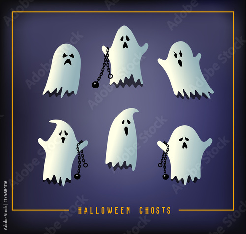 Set of six halloween ghosts with different poses and expressions. Vector Illustration