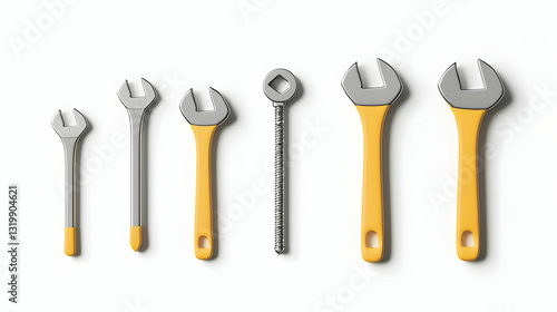 Set Of Six Metal Wrenches With Yellow Handles Arranged By Size On A White Background In A Studio Setting With Soft Lighting