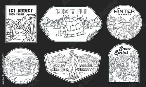 Set of six monochrome emblems featuring people enjoying various winter sports and activities, such as skiing, snowboarding, and building an igloo