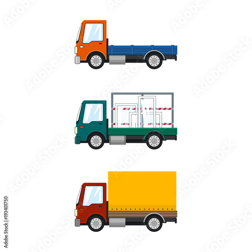 Set of Small Cargo Trucks Isolated, Orange Mini Lorry without Load, Car with Windows, Closed Truck, Transport and Logistics, Delivery Services, Vector Illustration