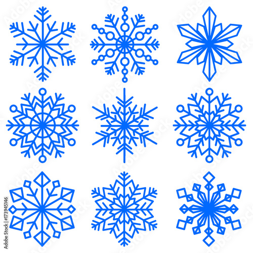 set of snowflakes of different shapes. Collection of decorative snowflakes images. Vector illustration.