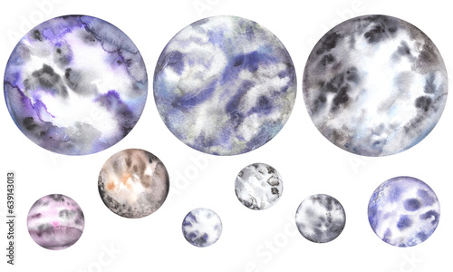 Set of space planets with texture and streaks, colorful abstract geometric circle. Watercolor illustration isolated on transparent background
