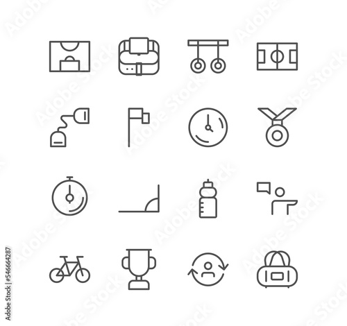 Set of sports equipment and soccer icons, trophy, award, football, fitness, stopwatch and linear variety symbols.