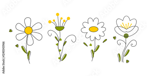 Set of spring flowers in outline on white background. Trendy minimalist flower designs.