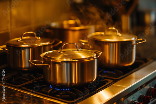 Set of stainless steel pot simmering stove warm kitchen lighting casting soft highlight their polished surface golden glow add depth scene making kitchen feel cozy inviting perfect preparing delicious