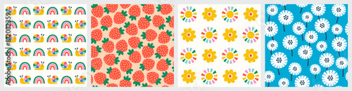 Set of summer vector seamless patterns. Childish cute naive hand drawn summer patterns design for children's textile, packaging, paper bags, wrapping paper