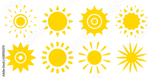 Set of sun flat cartoon icons. Abstract different shape summer symbol. Simple banner template decorative element for logo. Sign morning, weather, spring season. Isolated on white vector illustration