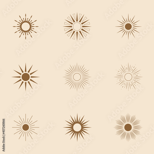 Set of sun linear icons and symbols in boho style. Vector abstract elements for logo design, decoration in modern minimalist style. Flat vector illustration