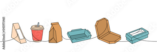 Set of takeaway cardboard boxes one line colored drawing. Empty cardboard boxes, bags for takeaway food continuous one line colorful illustration.
