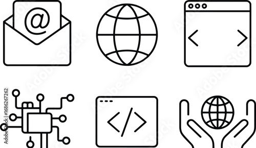 Set of technology and digital icons featuring email, globe, browser window, circuit board, code, and hands holding the earth isolated on white background