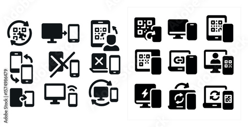 Set of technology icons: QR code, monitor, smartphone, tablet, person, cycle arrows.