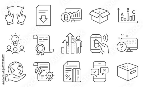 Set of Technology icons, such as Phone survey, Credit card. Diploma, ideas, save planet. Cogwheel, Bitcoin pay, Survey results. Open box, Bitcoin chart, Move gesture. Vector