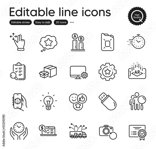 Set of Technology outline icons. Contains icons as Inspect, Certificate and Canister oil elements. Usb stick, Move gesture, Idea web signs. Timer, Truck delivery, Recovery photo elements. Vector