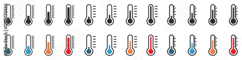 Set of temperature icons. Thermometer showing the temperature, thermometer symbol. Temperature scale, warm, cold, weather. Vector illustration. EPS10.