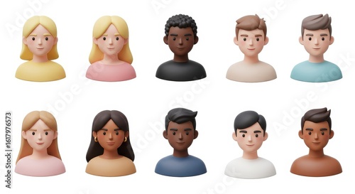 Set of Ten 3D Cartoon Avatars with Diverse Hairstyles and Skin Tones Isolated on Solid White Background