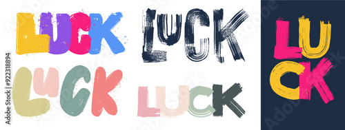 Set of text Luck word, cute and funny lettering in simple comic doodle, brush stroke style. Collection of template colorful childlike naive modern hand-drawn text design. Vector illustration.