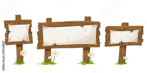 Set of three different cartoon wooden signs with flowers