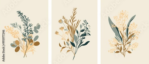 Set of three minimalist botanical wall art prints in neutral and sage green tones