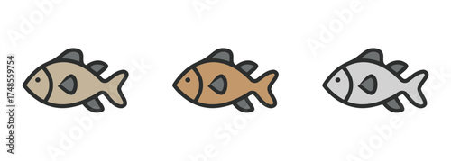 Set of three stylized fish icons in different colors (grey and brown). Ideal for use in projects about seafood, fishing, ocean life, cooking, or marine animals.