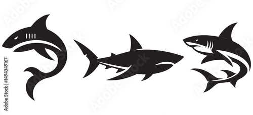 Set of Three Tribal Shark Silhouettes in Black – Stylized Ocean Predator Vector Icons for Modern Tattoo Art, Surf and Dive Branding, eSports Logos, and Graphic Design Collections