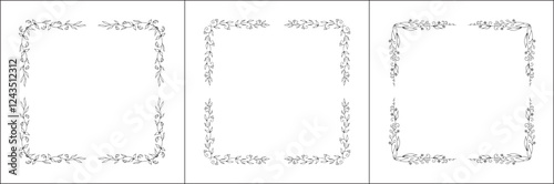 Set of three vegetal vector frames with forest flowers and leaves. Black and white. Vector frame for all sizes and formats. Isolated vector illustration.