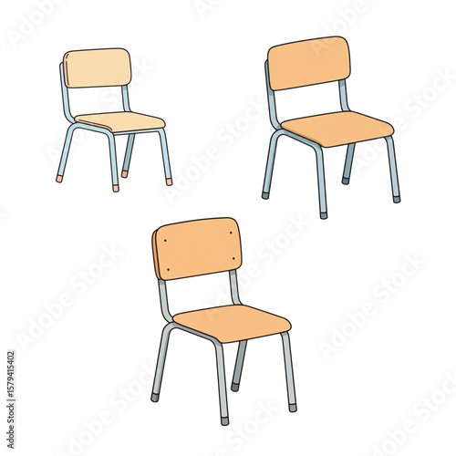 Set of three wooden school chairs in simple design no background, isolated set