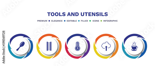 set of tools and utensils filled icons. tools and utensils filled icons with infographic template. flat icons such as large spoon, hanging ladder, thermometers, up arrow and cloud, cup of hot coffee