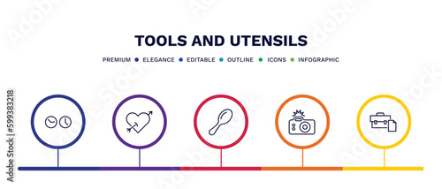 set of tools and utensils thin line icons. tools and utensils outline icons with infographic template. linear icons such as clocks, tattoo, large spoon, camera with flash, briefcase and document