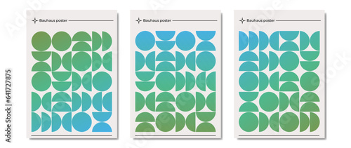Set of trendy geometric posters in gradient style with bauhaus elements with green-blue elements. Fashion design for print, wall decor, poster art, banner.
