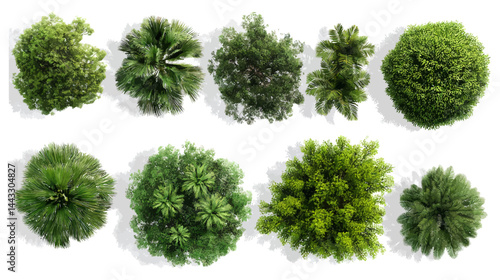 Set of tropical green tree top view isolated on white background for landscape plan and architecture drawing, elements for environment and garden -