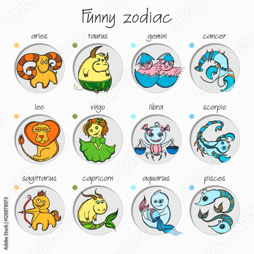 Set of twelve funny zodiac signs.