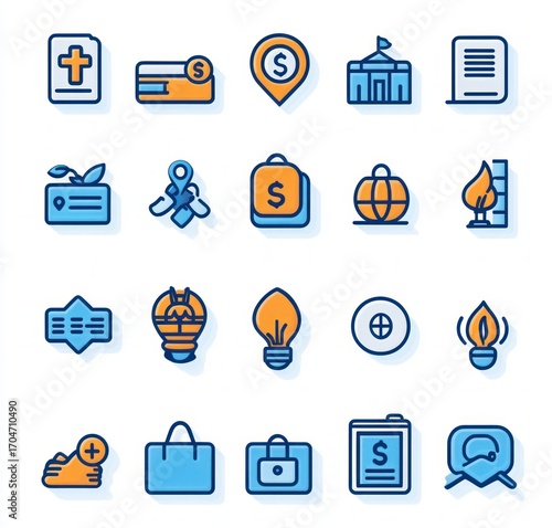 Set of twenty colorful flat financial, business, and office related icons including credit card, location pin, building, documents, globe, light bulbs, briefcase, and headset