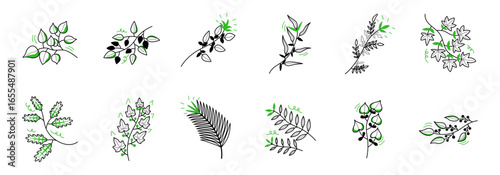 Set of unique line drawings of stylized branches with various leaf shapes and color accents.