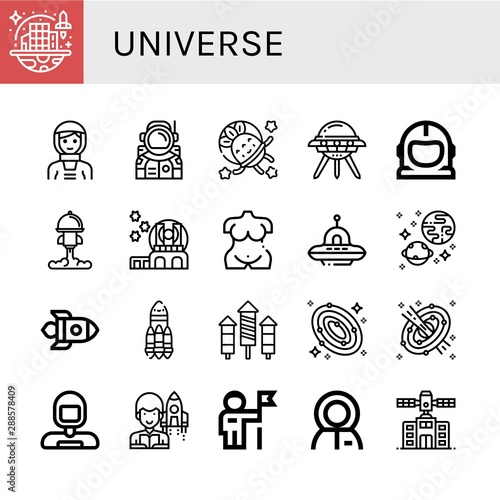 Set of universe icons such as Space colonization, Astronaut, Ufo, Space suit, Rocket, Observatory, Venus, Universe, Galaxy, Space, Astronomer, Planetarium , universe