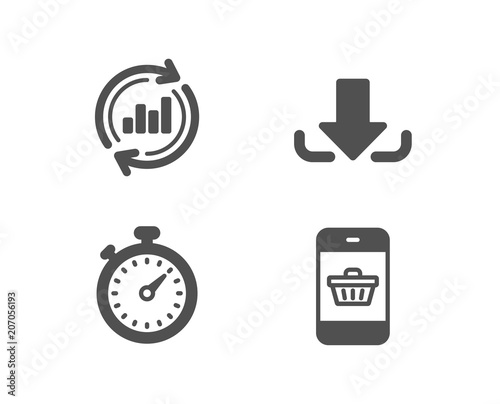 Set of Update data, Download and Timer icons. Smartphone buying sign. Sales chart, Load file, Stopwatch gadget. Website shopping. Quality design elements. Classic style. Vector