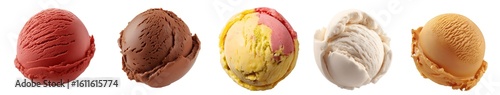Set of various Ice cream scoops of different flavors and colors isolated on transparent background