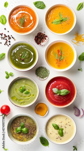 Set of various seasonal vegetable soups and organic ingredients on white background