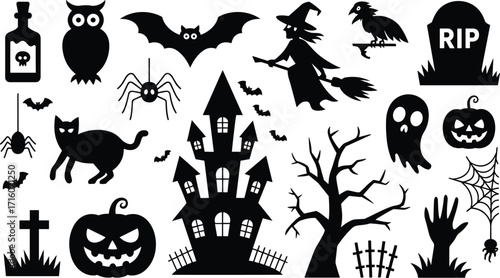 Set of various spooky black Halloween silhouettes including a haunted house, witch, pumpkins, bats, ghosts, and a black cat on a white background.