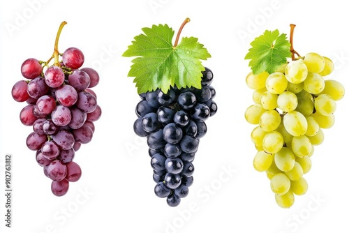Set of various types of grapes (Black, white and red grape) with leaf flying isolated on white background , ai