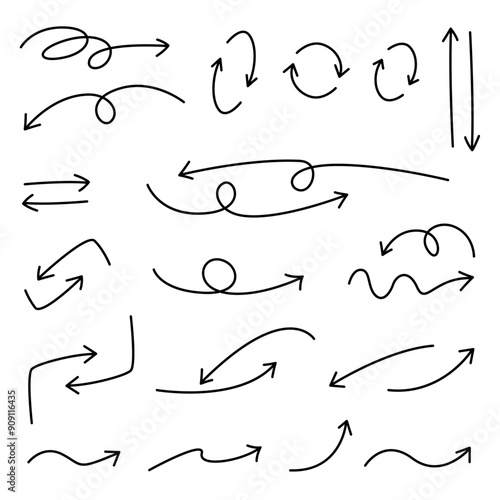 Set of vector arrows on a white background. Vector hand drawn arrows, arrows indicating direction. Design elements. Collection of different arrows