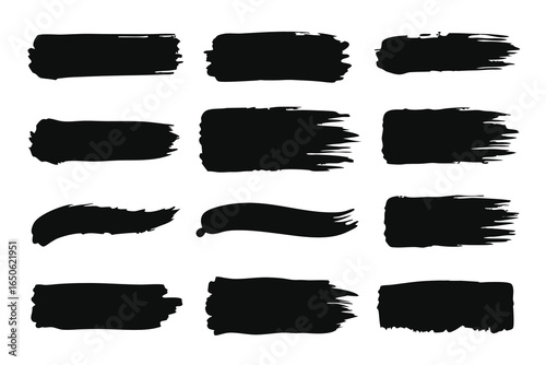 Set of vector black paint, ink brush stroke, brush, line, or texture. Dirty artistic design element, box, frame on white background