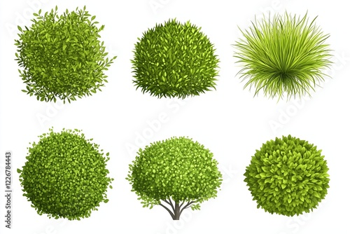 Set of vector bush illustrations on a white background. Green flat bushes on white background. Green grass vector set. Shrub bush shrubbery tree simple abstract. Eco element, foliage, stylized ecology